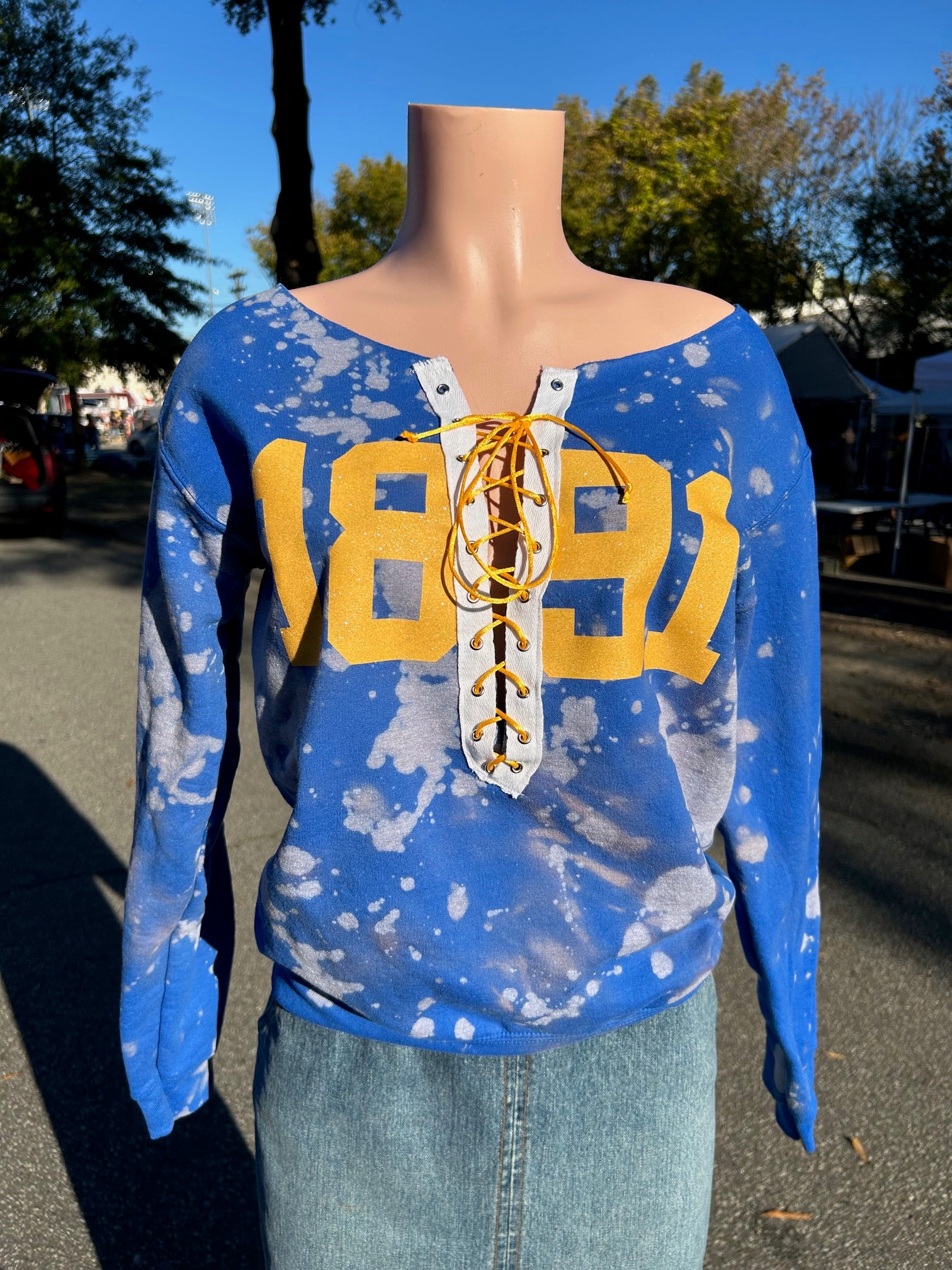 Handmade “1891 Aggie Bulldog” Off Shoulder Lace Up Sweatshirt