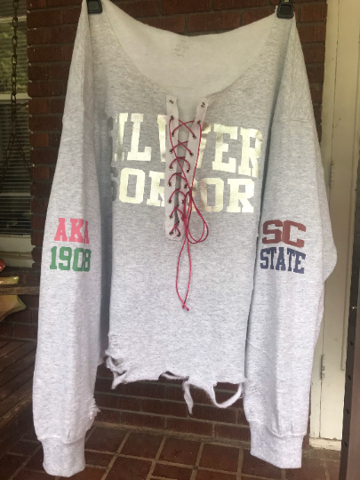 Custom Handmade SILVER SOROR Double Sleeve Design Lace-Up Off-Shoulder Sweatshirt