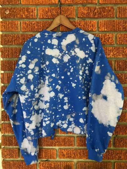 The picture in the listing is in the longer crop and distressed style. If you would like your sweatshirt light to moderately distressed please let us know in the "instructions for seller" section.