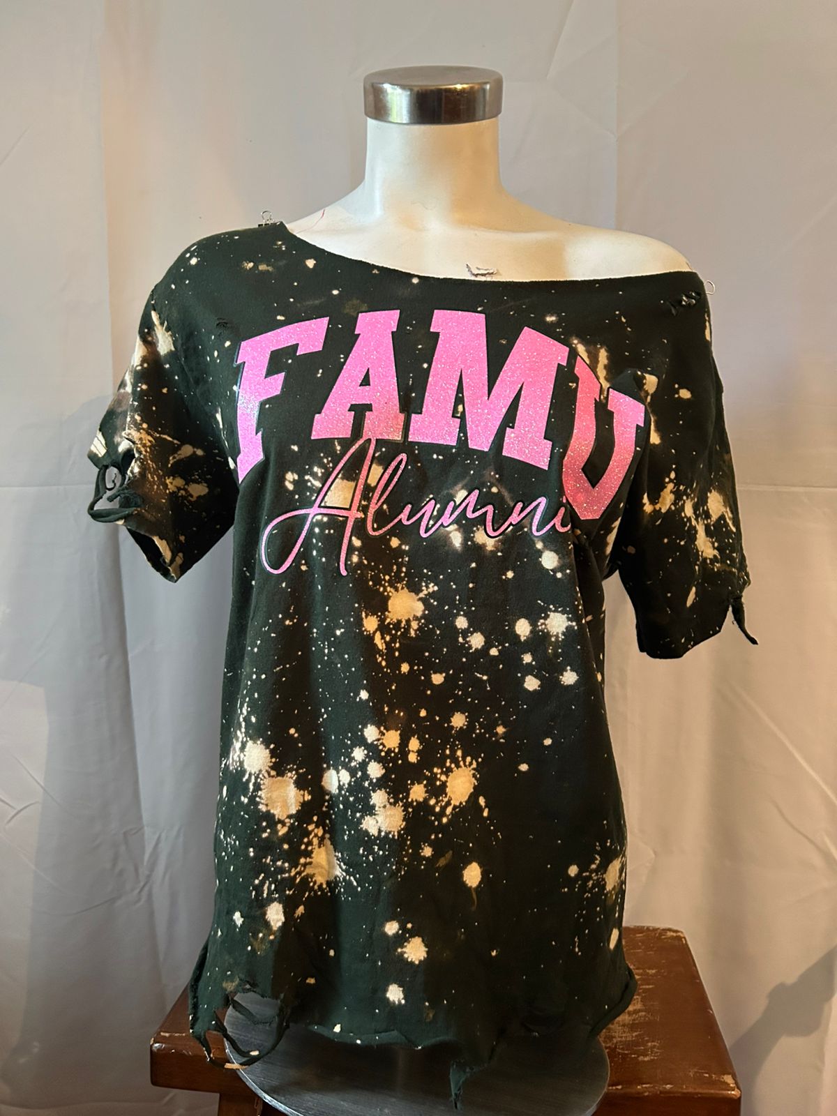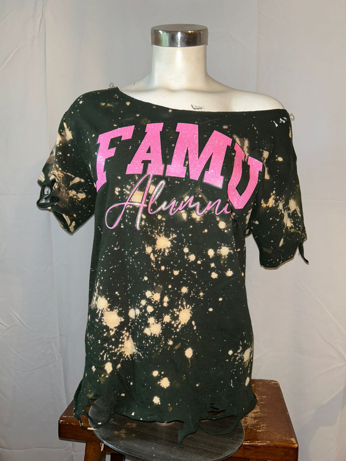 Handmade FAMU Alumni Hot Pink Glitter on Forest Bleached Crew Neck or Off-Shoulder T-Shirt