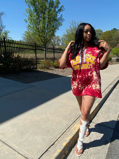 All of our styles are men's sizing. We do still recommend you order your natural women’s size for the most comfortable, conservative fit. You can order one size down if you prefer a snug, more form fitting fit. Order one size up for a loose/ boyfriend fit. Order two sizes up for an oversized look to wear with biker shorts or leggings. If you prefer a mini-dress fit, see below: