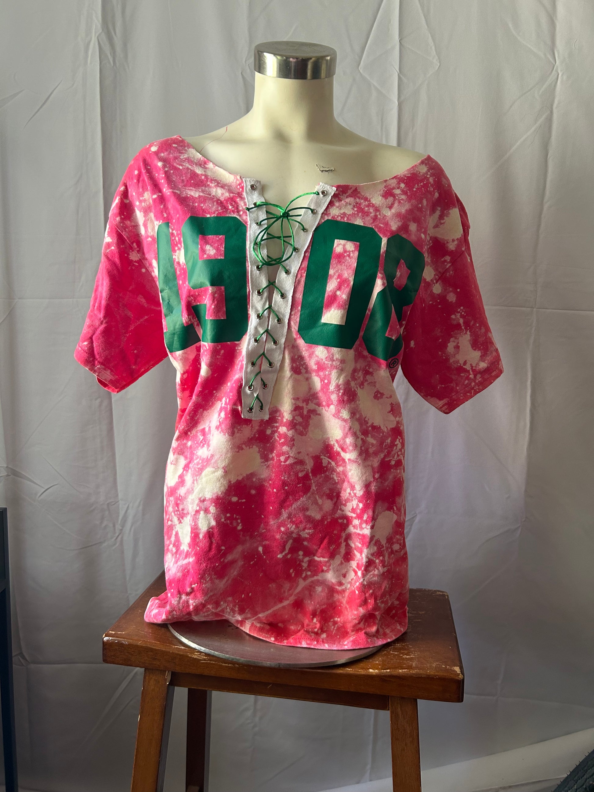This design is hand-bleached and hand-sewn by Cami and her team. It features an optional off-the-shoulder neckline with an adjustable lace-up design across the chest.