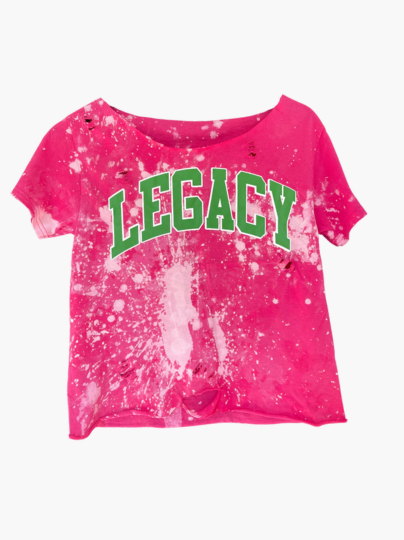 This design is hand-bleached and hand-sewn by Cami and her team. It features a classic crew neckline and a kelly green and pink 'Legacy' chest design.