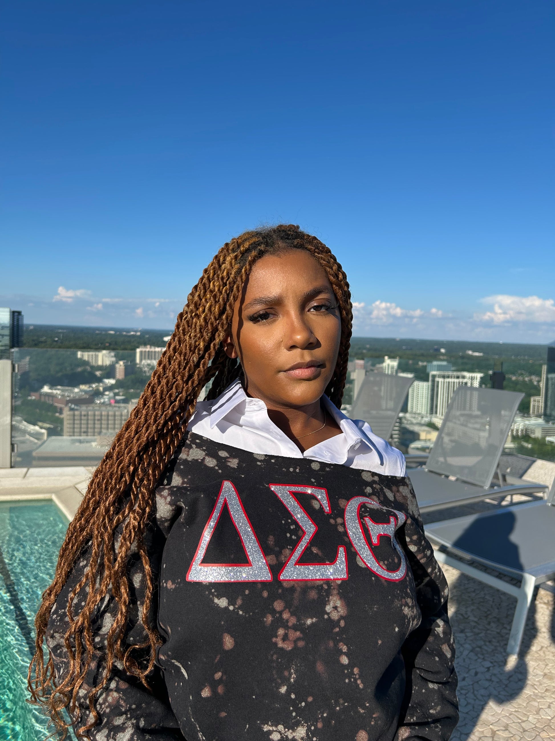 This Delta Sigma Theta design is hand-bleached and hand-distressed by Cami and her design team in Atlanta, Georgia. Pictured is Off Shoulder, Full Length, with No Distress. Get it customized in a style that's right for you!